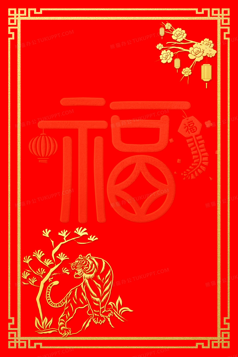 本作品内容为红金国风虎年福到了背景, 格式为 psd, 大小330 MB, 图片尺寸为7087 x 10630, 作品中背景图片无需修改, 源文件无水印,可以直接使用, 欢迎使用熊猫办公。 如认为平台内容涉嫌侵权,可通过邮件:tousu@tukuppt.com提出书面通知,我们将及时处理。
