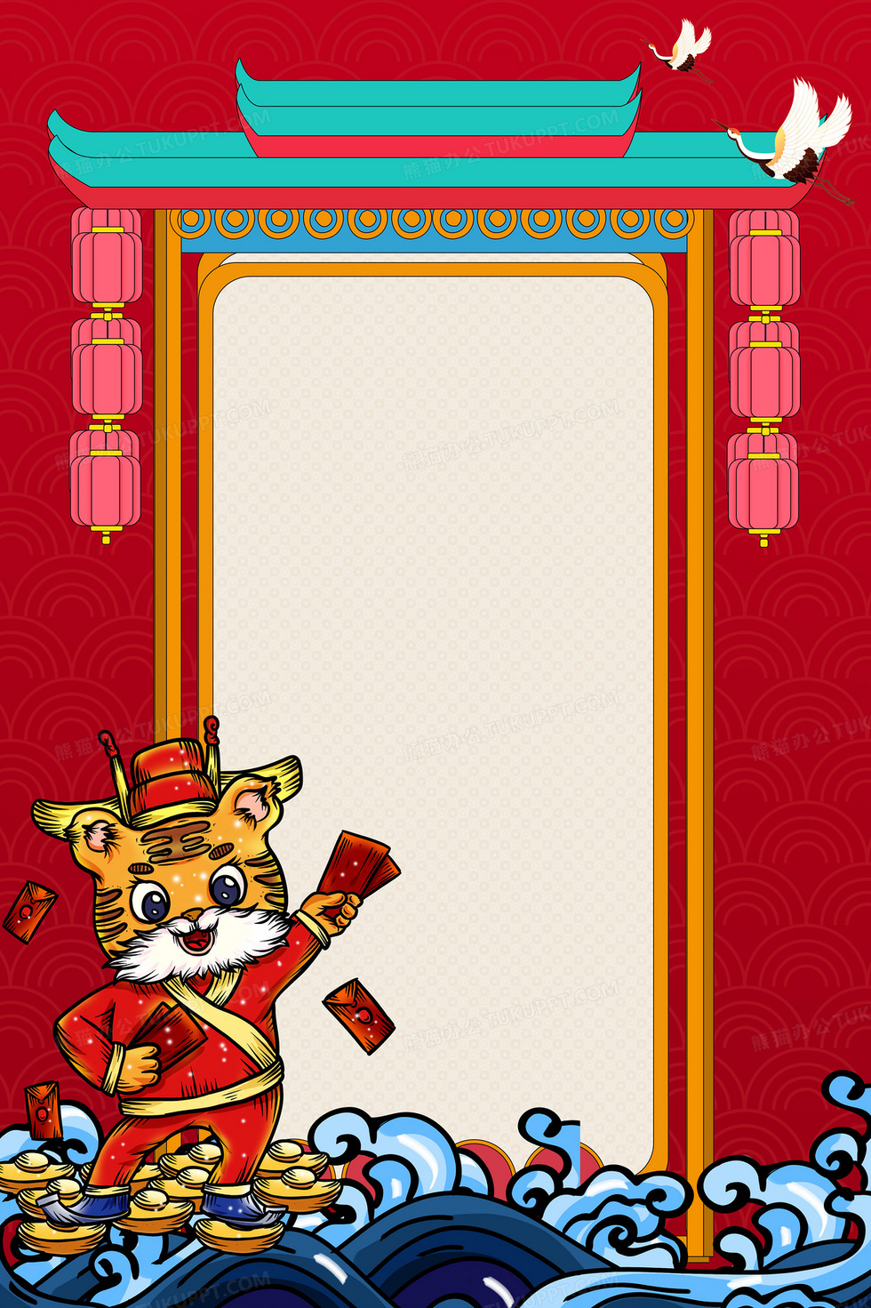 本作品内容为2022年虎年新年国潮边框背景, 格式为 psd, 大小33 MB, 图片尺寸为3543 x 5316, 作品中背景图片无需修改, 源文件无水印,可以直接使用, 欢迎使用熊猫办公。 如认为平台内容涉嫌侵权,可通过邮件:tousu@tukuppt.com提出书面通知,我们将及时处理。