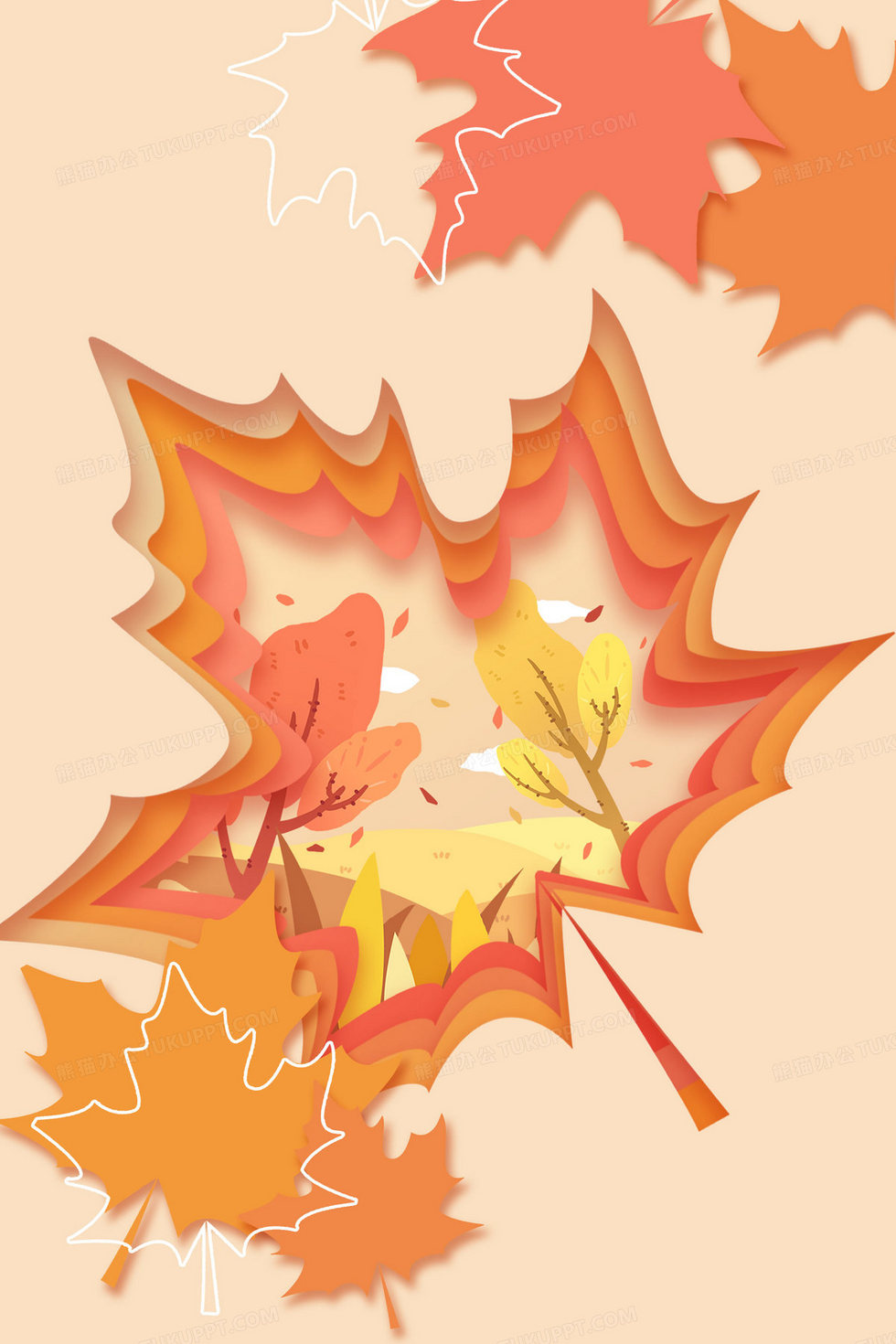 本作品内容为创意剪纸风秋天枫叶背景, 格式为 psd, 大小16 MB, 图片尺寸为2362 x 3543, 作品中背景图片无需修改, 源文件无水印,可以直接使用, 欢迎使用熊猫办公。 如认为平台内容涉嫌侵权,可通过邮件:tousu@tukuppt.com提出书面通知,我们将及时处理。