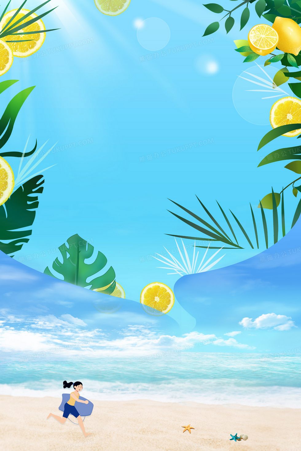 本作品内容为创意夏日沙滩海浪柠檬合成背景, 格式为 psd, 大小80 MB, 图片尺寸为2362 x 3543, 作品中背景图片无需修改, 源文件无水印,可以直接使用, 欢迎使用熊猫办公。 如认为平台内容涉嫌侵权,可通过邮件:tousu@tukuppt.com提出书面通知,我们将及时处理。