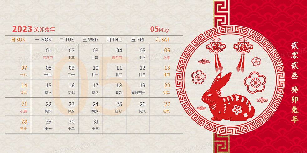 本作品内容为红色烫金兔年五月日历装饰素材, 格式为 psd, 大小54 MB, 图片尺寸为4724 x 2362, 作品中背景图片无需修改, 源文件无水印,可以直接使用, 欢迎使用熊猫办公。 如认为平台内容涉嫌侵权,可通过邮件:tousu@tukuppt.com提出书面通知,我们将及时处理。