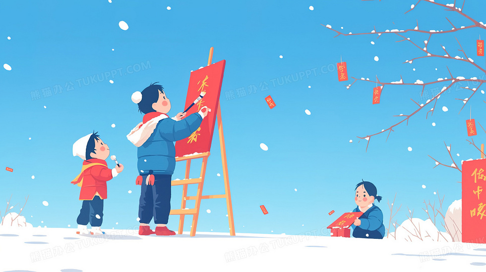 本作品内容为雪地写新春对联的一家人插画, 格式为 jpg, 大小2 MB, 图片尺寸为2912 x 1632, 源文件无水印, 欢迎使用熊猫办公。 如认为平台内容涉嫌侵权,可通过邮件:tousu@tukuppt.com提出书面通知,我们将及时处理。