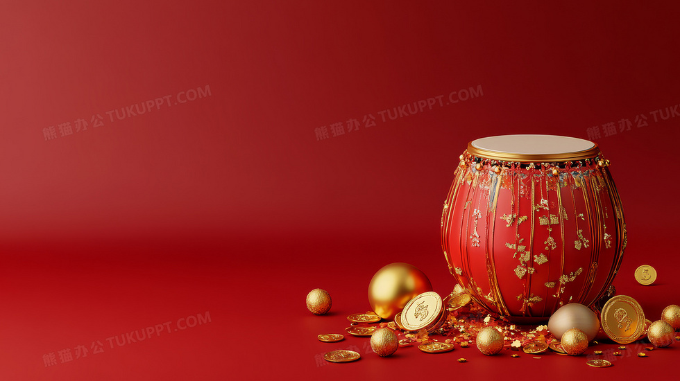 本作品内容为3D新年红色鼓金币背景, 格式为 jpg, 大小5 MB, 图片尺寸为2912 x 1632, 作品中背景图片无需修改, 源文件无水印,可以直接使用, 欢迎使用熊猫办公。 如认为平台内容涉嫌侵权,可通过邮件:tousu@tukuppt.com提出书面通知,我们将及时处理。