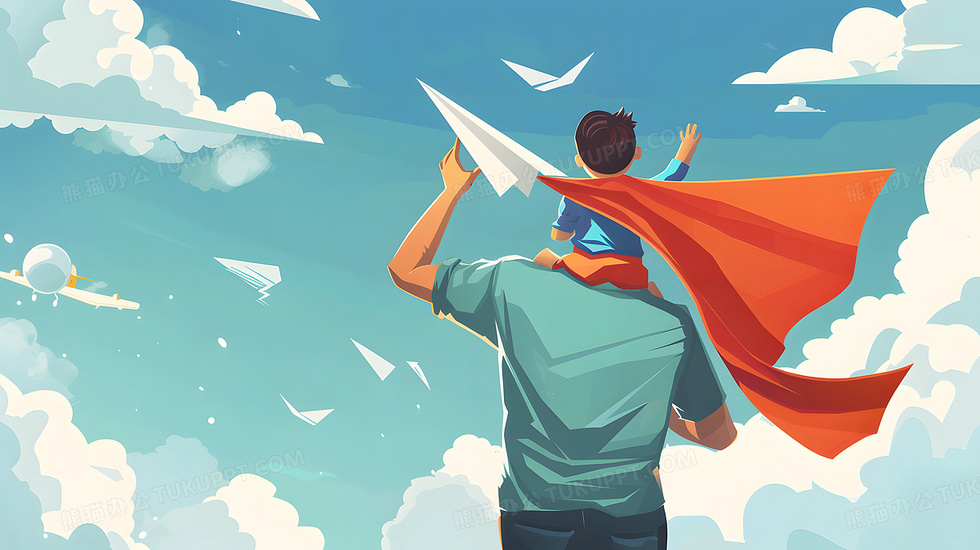 本作品内容为父亲节海报孩子和父亲飞纸飞机卡通插画, 格式为 jpg, 大小7 MB, 图片尺寸为5824 x 3264, 源文件无水印, 欢迎使用熊猫办公。 如认为平台内容涉嫌侵权,可通过邮件:tousu@tukuppt.com提出书面通知,我们将及时处理。