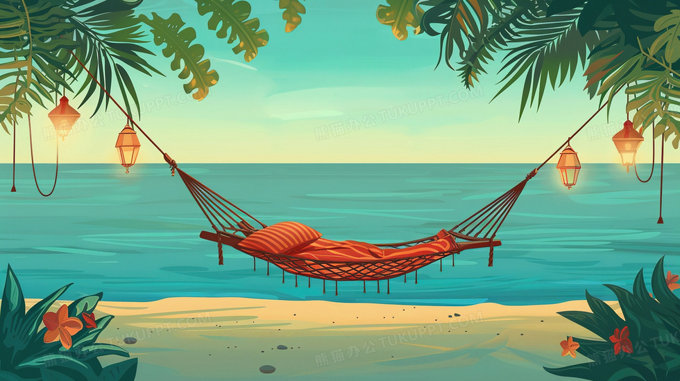 本作品内容为夏季海边沙滩度假吊床插画, 格式为 jpg, 大小3 MB, 图片尺寸为2912 x 1632, 源文件无水印, 欢迎使用熊猫办公。 如认为平台内容涉嫌侵权,可通过邮件:tousu@tukuppt.com提出书面通知,我们将及时处理。