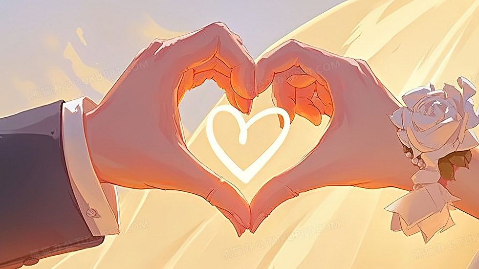本作品内容为新婚夫妻手指比心手部特写插画, 格式为 jpg, 大小2 MB, 图片尺寸为2912 x 1632, 源文件无水印, 欢迎使用熊猫办公。 如认为平台内容涉嫌侵权,可通过邮件:tousu@tukuppt.com提出书面通知,我们将及时处理。