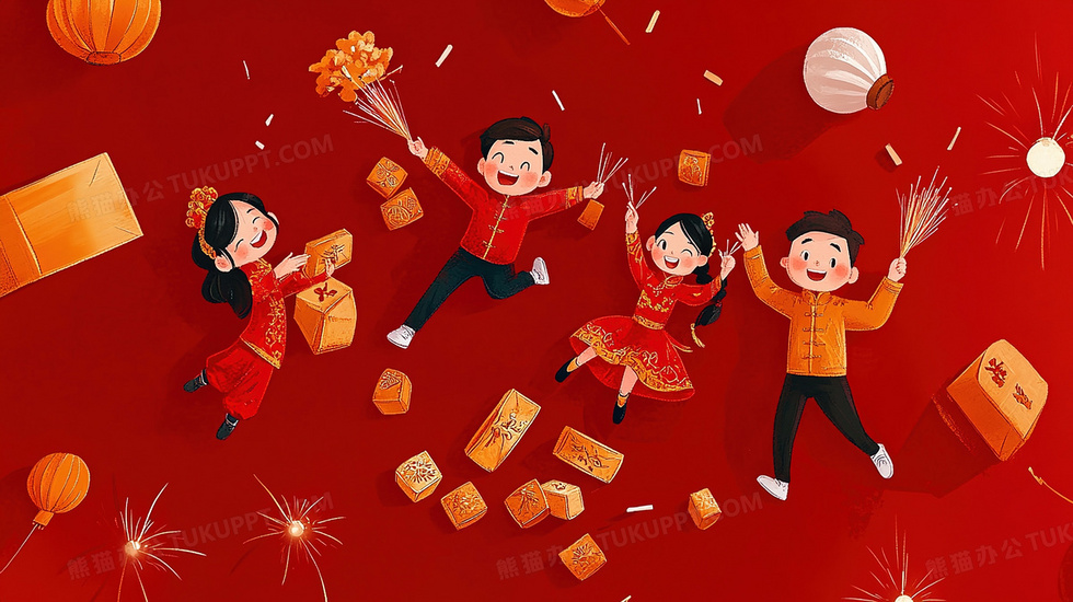 本作品内容为卡通人物在红色背景上的喜庆插画, 格式为 jpg, 大小2 MB, 图片尺寸为2912 x 1632, 源文件无水印, 欢迎使用熊猫办公。 如认为平台内容涉嫌侵权,可通过邮件:tousu@tukuppt.com提出书面通知,我们将及时处理。