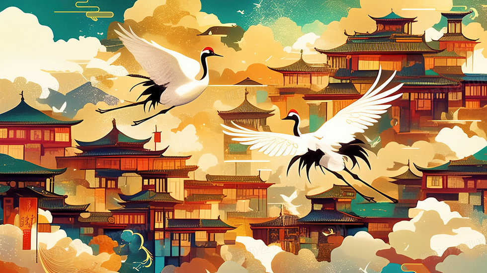 本作品内容为唯美古建筑与仙鹤插画, 格式为 jpg, 大小3 MB, 图片尺寸为2912 x 1632, 源文件无水印, 欢迎使用熊猫办公。 如认为平台内容涉嫌侵权,可通过邮件:tousu@tukuppt.com提出书面通知,我们将及时处理。