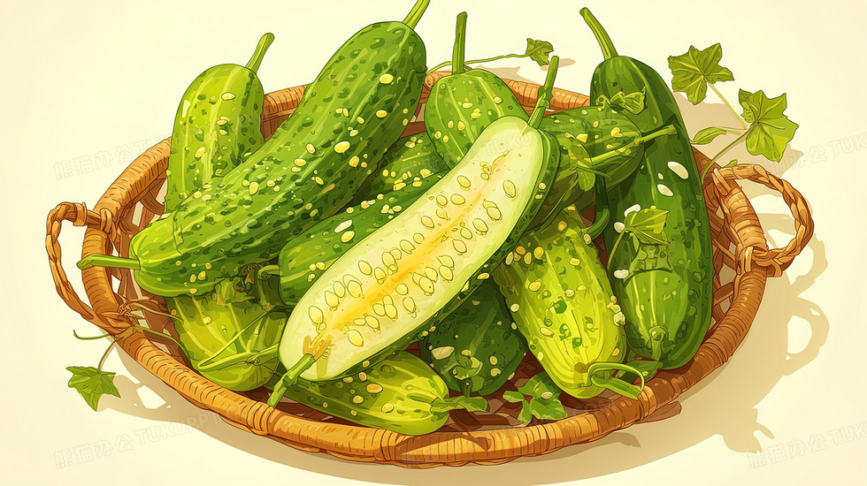 本作品内容为竹篮里的解暑美食苦瓜插画, 格式为 jpg, 大小6 MB, 图片尺寸为2912 x 1632, 源文件无水印, 欢迎使用熊猫办公。 如认为平台内容涉嫌侵权,可通过邮件:tousu@tukuppt.com提出书面通知,我们将及时处理。