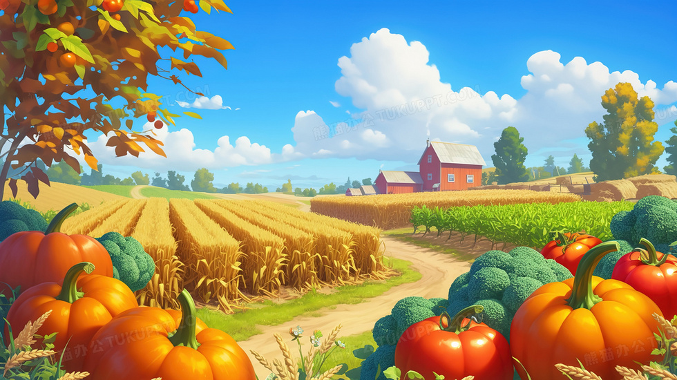 本作品内容为蓝天白云农田秋季丰收瓜果插画, 格式为 jpg, 大小3 MB, 图片尺寸为2912 x 1632, 源文件无水印, 欢迎使用熊猫办公。 如认为平台内容涉嫌侵权,可通过邮件:tousu@tukuppt.com提出书面通知,我们将及时处理。