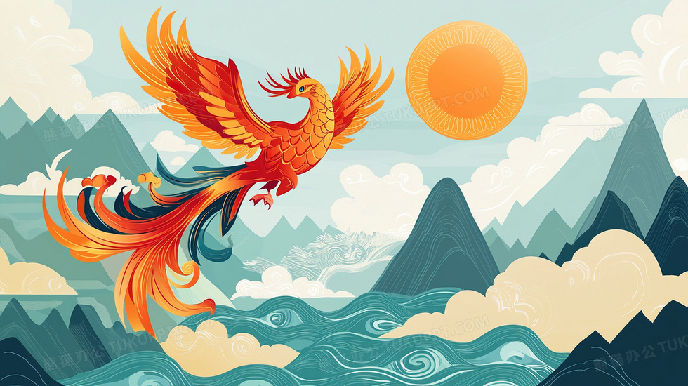 本作品内容为国潮中国风凤凰吉祥神兽插画, 格式为 jpg, 大小3 MB, 图片尺寸为2912 x 1632, 源文件无水印, 欢迎使用熊猫办公。 如认为平台内容涉嫌侵权,可通过邮件:tousu@tukuppt.com提出书面通知,我们将及时处理。
