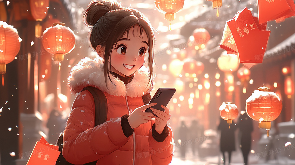 本作品内容为卡通女孩手机收红包的插画, 格式为 jpg, 大小2 MB, 图片尺寸为2912 x 1632, 源文件无水印, 欢迎使用熊猫办公。 如认为平台内容涉嫌侵权,可通过邮件:tousu@tukuppt.com提出书面通知,我们将及时处理。