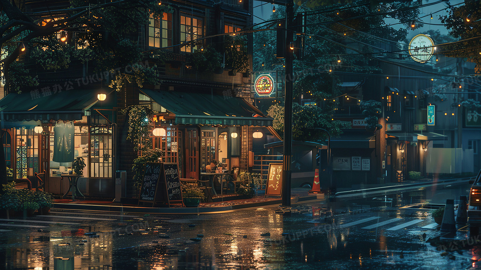 本作品内容为雨后街道夜景插画, 格式为 jpg, 大小4 MB, 图片尺寸为2912 x 1632, 源文件无水印, 欢迎使用熊猫办公。 如认为平台内容涉嫌侵权,可通过邮件:tousu@tukuppt.com提出书面通知,我们将及时处理。