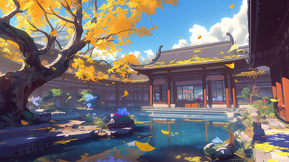 本作品内容为秋天古建筑庭院里枯黄的树木插画, 格式为 jpg, 大小6 MB, 图片尺寸为2890 x 1626, 源文件无水印, 欢迎使用熊猫办公。 如认为平台内容涉嫌侵权,可通过邮件:tousu@tukuppt.com提出书面通知,我们将及时处理。