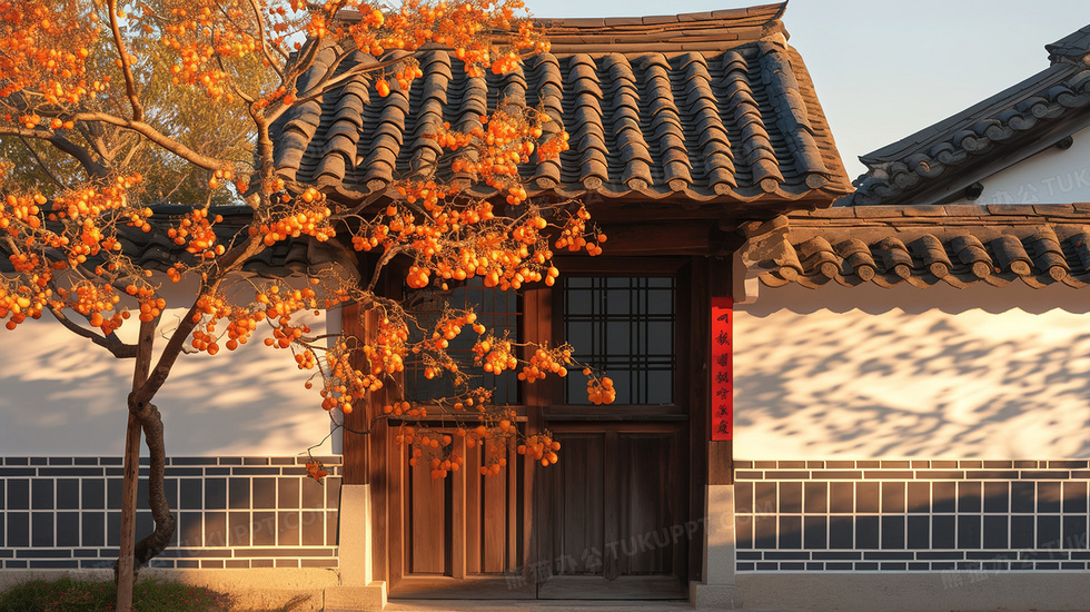 秋季墙外树长满果实插画