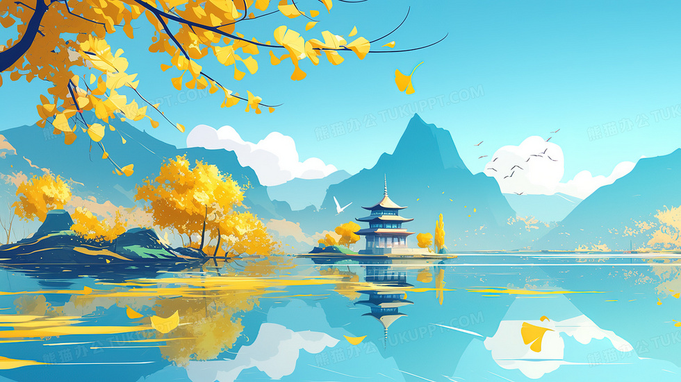 本作品内容为中国风秋天银杏树山水插画, 格式为 jpg, 大小6 MB, 图片尺寸为2876 x 1618, 源文件无水印, 欢迎使用熊猫办公。 如认为平台内容涉嫌侵权,可通过邮件:tousu@tukuppt.com提出书面通知,我们将及时处理。