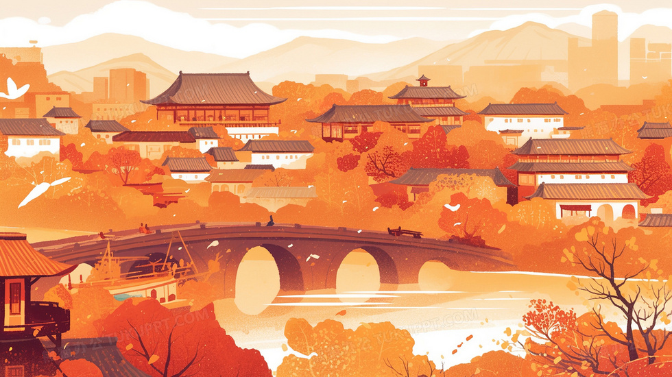 首页 > 插画 > 科技艺术 > 中国风 > 橘黄色秋季村落古镇拱桥房屋风景插画