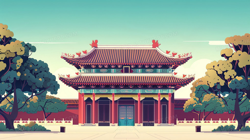本作品内容为蓝天白云古典建筑绿树插画, 格式为 jpg, 大小3 MB, 图片尺寸为2912 x 1632, 源文件无水印, 欢迎使用熊猫办公。 如认为平台内容涉嫌侵权,可通过邮件:tousu@tukuppt.com提出书面通知,我们将及时处理。
