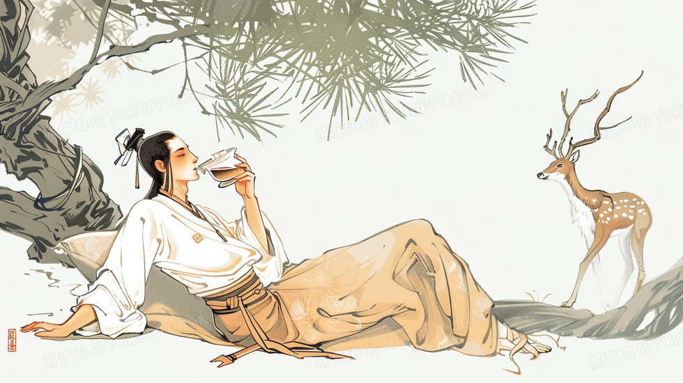 本作品内容为诗人在树下喝酒的插画背景, 格式为 jpg, 大小3 MB, 图片尺寸为2912 x 1632, 作品中背景图片无需修改, 源文件无水印,可以直接使用, 欢迎使用熊猫办公。 如认为平台内容涉嫌侵权,可通过邮件:tousu@tukuppt.com提出书面通知,我们将及时处理。