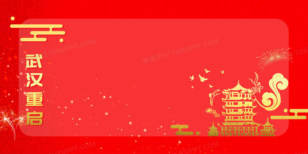 本作品内容为红色武汉重启黄鹤楼背景, 格式为 psd, 大小39 MB, 图片尺寸为4724 x 2362, 作品中背景图片无需修改, 源文件无水印,可以直接使用, 欢迎使用熊猫办公。 如认为平台内容涉嫌侵权,可通过邮件:tousu@tukuppt.com提出书面通知,我们将及时处理。