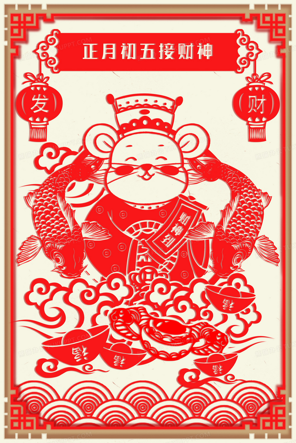 本作品内容为鼠年习俗手绘接财神剪纸风背景, 格式为 psd, 大小13 MB, 图片尺寸为2343 x 3508, 作品中背景图片无需修改, 源文件无水印,可以直接使用, 欢迎使用熊猫办公。 如认为平台内容涉嫌侵权,可通过邮件:tousu@tukuppt.com提出书面通知,我们将及时处理。