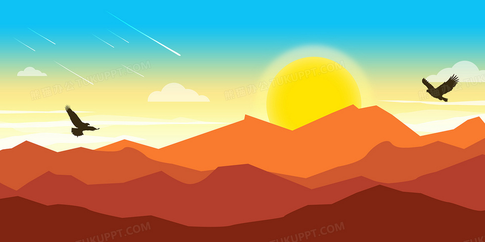 本作品内容为日出山峰剪影太阳升起雄鹰剪影背景, 格式为 psd, 大小2 MB, 图片尺寸为4724 x 2362, 作品中背景图片无需修改, 源文件无水印,可以直接使用, 欢迎使用熊猫办公。 如认为平台内容涉嫌侵权,可通过邮件:tousu@tukuppt.com提出书面通知,我们将及时处理。