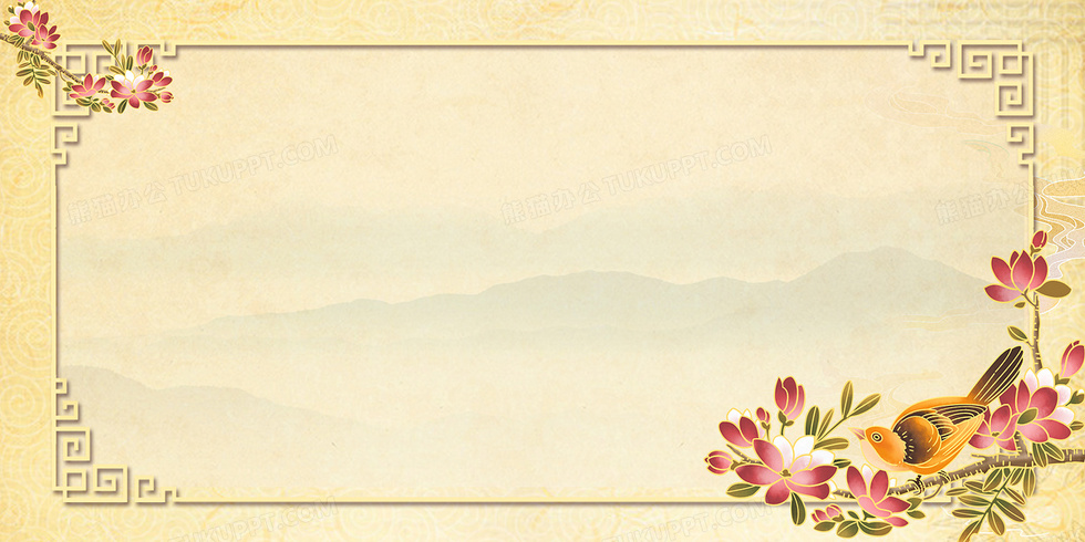 本作品内容为中国风典雅复古花鸟边框背景, 格式为 psd, 大小95 MB, 图片尺寸为4724 x 2362, 作品中背景图片无需修改, 源文件无水印,可以直接使用, 欢迎使用熊猫办公。 如认为平台内容涉嫌侵权,可通过邮件:tousu@tukuppt.com提出书面通知,我们将及时处理。