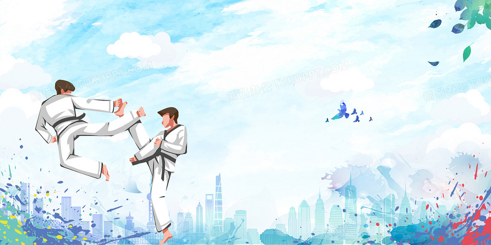本作品内容为跆拳道比赛体育运动水墨城市背景, 格式为 psd, 大小33 MB, 图片尺寸为4724 x 2362, 作品中背景图片无需修改, 源文件无水印,可以直接使用, 欢迎使用熊猫办公。 如认为平台内容涉嫌侵权,可通过邮件:tousu@tukuppt.com提出书面通知,我们将及时处理。