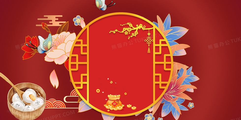 本作品内容为红色传统习俗元宵节背景, 格式为 psd, 大小27 MB, 图片尺寸为4724 x 2362, 作品中背景图片无需修改, 源文件无水印,可以直接使用, 欢迎使用熊猫办公。 如认为平台内容涉嫌侵权,可通过邮件:tousu@tukuppt.com提出书面通知,我们将及时处理。