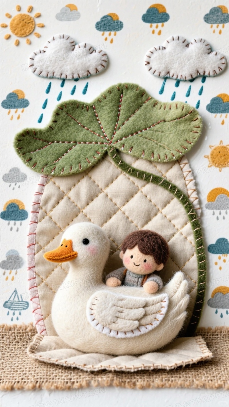 本作品内容为布艺拼贴艺术风格毛毡小鸭与棉布孩童窝在绗缝荷叶下, 格式为 jpg, 大小1 MB, 图片尺寸为936 x 1664, 源文件无水印, 欢迎使用熊猫办公。 如认为平台内容涉嫌侵权,可通过邮件:tousu@tukuppt.com提出书面通知,我们将及时处理。