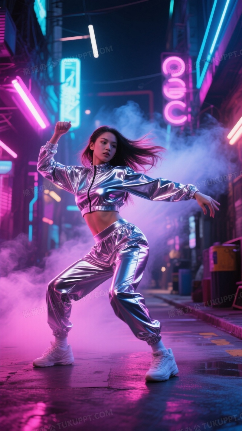 本作品内容为霓虹灯下的城市街道年轻女性穿着闪亮银色运动装跳街舞, 格式为 jpg, 大小1 MB, 图片尺寸为936 x 1664, 源文件无水印, 欢迎使用熊猫办公。 如认为平台内容涉嫌侵权,可通过邮件:tousu@tukuppt.com提出书面通知,我们将及时处理。