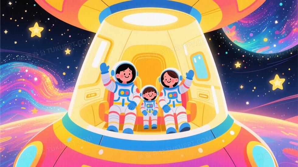 本作品内容为可爱风卡通插画一家人穿着宇航服坐在色彩斑斓的宇宙飞船里探险, 格式为 jpg, 大小1 MB, 图片尺寸为1664 x 936, 源文件无水印, 欢迎使用熊猫办公。 如认为平台内容涉嫌侵权,可通过邮件:tousu@tukuppt.com提出书面通知,我们将及时处理。