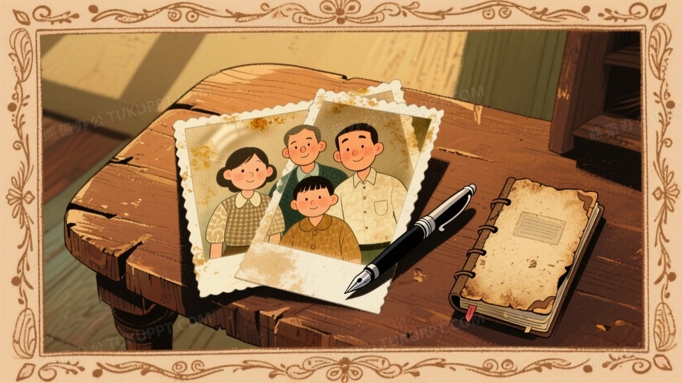本作品内容为复古风卡通插画老旧的木桌上放着一家五口的合影照片, 格式为 jpg, 大小1 MB, 图片尺寸为1664 x 936, 源文件无水印, 欢迎使用熊猫办公。 如认为平台内容涉嫌侵权,可通过邮件:tousu@tukuppt.com提出书面通知,我们将及时处理。