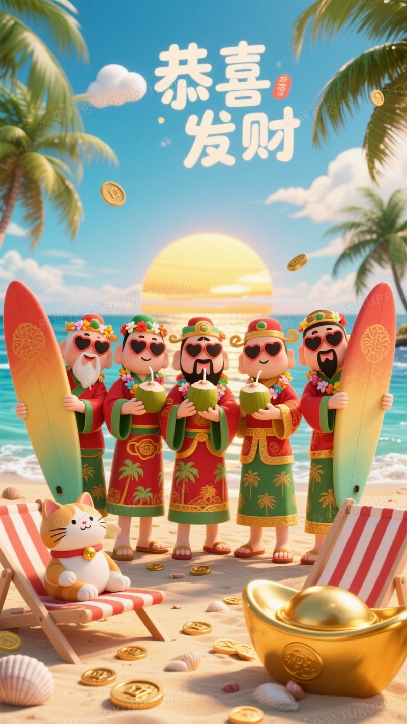 本作品内容为五位3D卡通财神穿着改良版传统服饰站在热带沙滩上, 格式为 jpg, 大小1 MB, 图片尺寸为936 x 1664, 源文件无水印, 欢迎使用熊猫办公。 如认为平台内容涉嫌侵权,可通过邮件:tousu@tukuppt.com提出书面通知,我们将及时处理。