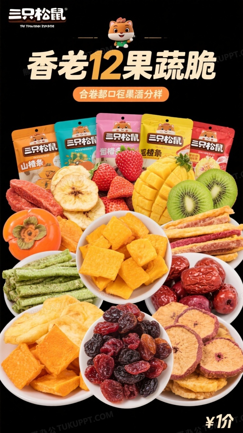 本作品内容为三只松鼠也来卷了整整十二种果蔬脆, 格式为 jpg, 大小1 MB, 图片尺寸为936 x 1664, 源文件无水印, 欢迎使用熊猫办公。 如认为平台内容涉嫌侵权,可通过邮件:tousu@tukuppt.com提出书面通知,我们将及时处理。