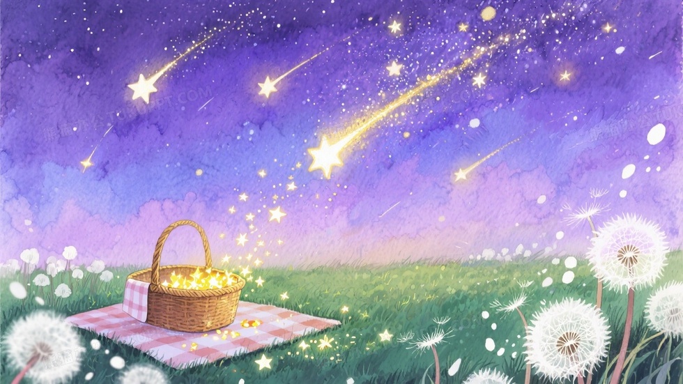 水彩风格流星雨插画渐变紫罗兰夜空划过金色流星轨迹