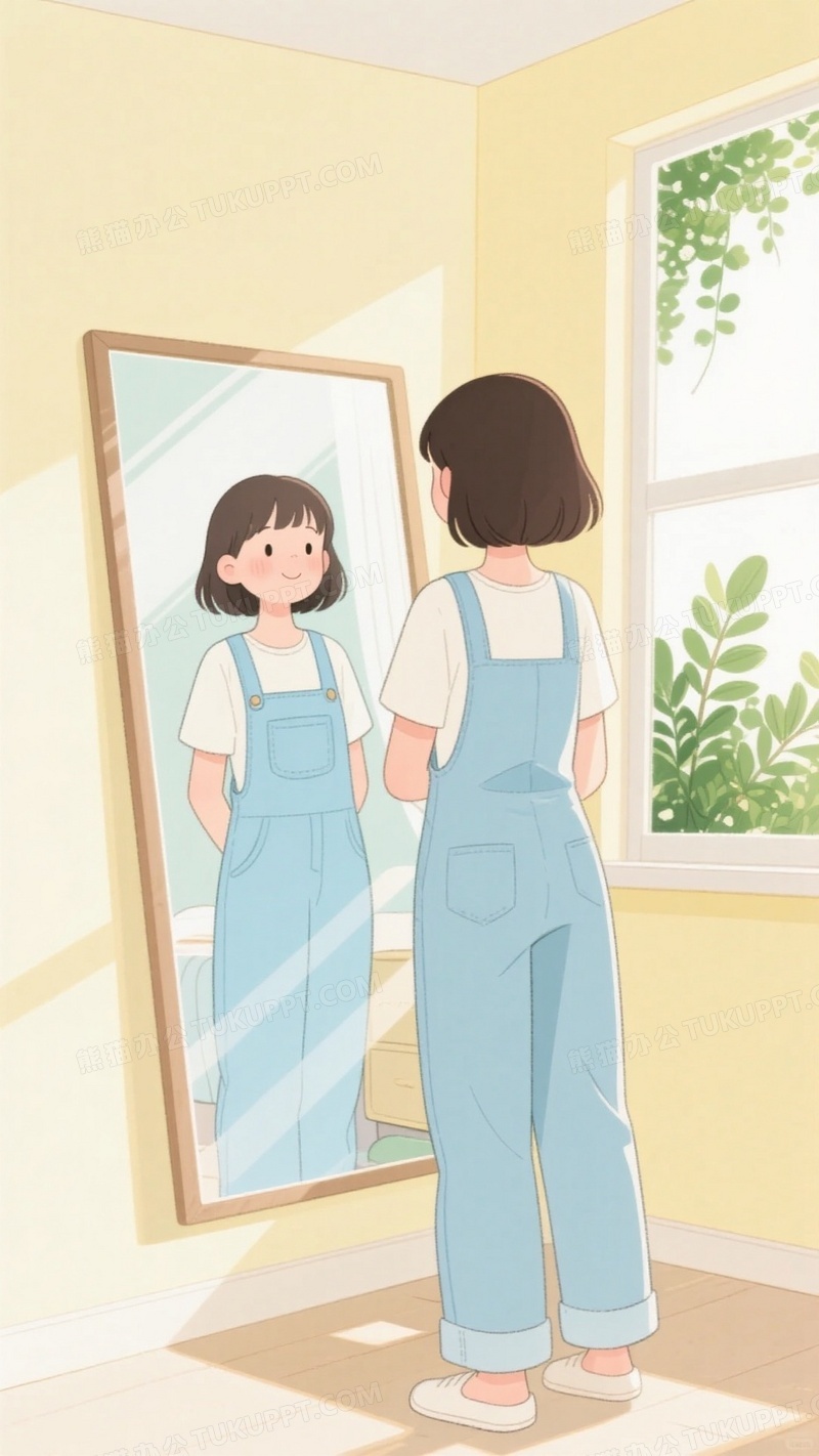 本作品内容为清新风格卡通插画女孩穿着淡蓝色背带裤套装对着全身镜, 格式为 jpg, 大小1 MB, 图片尺寸为936 x 1664, 源文件无水印, 欢迎使用熊猫办公。 如认为平台内容涉嫌侵权,可通过邮件:tousu@tukuppt.com提出书面通知,我们将及时处理。