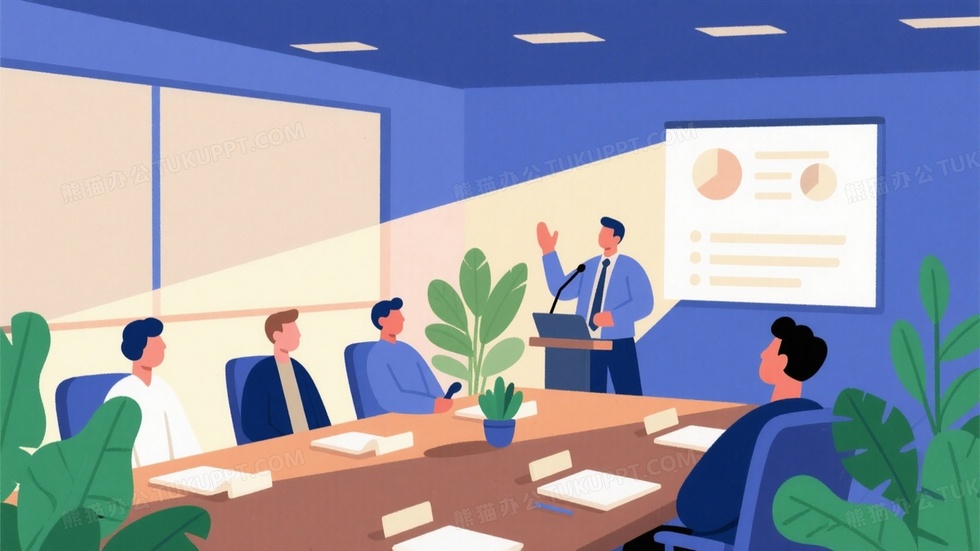 本作品内容为好看的扁平卡通插画呈现商务会议场景, 格式为 jpg, 大小1 MB, 图片尺寸为1664 x 936, 源文件无水印, 欢迎使用熊猫办公。 如认为平台内容涉嫌侵权,可通过邮件:tousu@tukuppt.com提出书面通知,我们将及时处理。