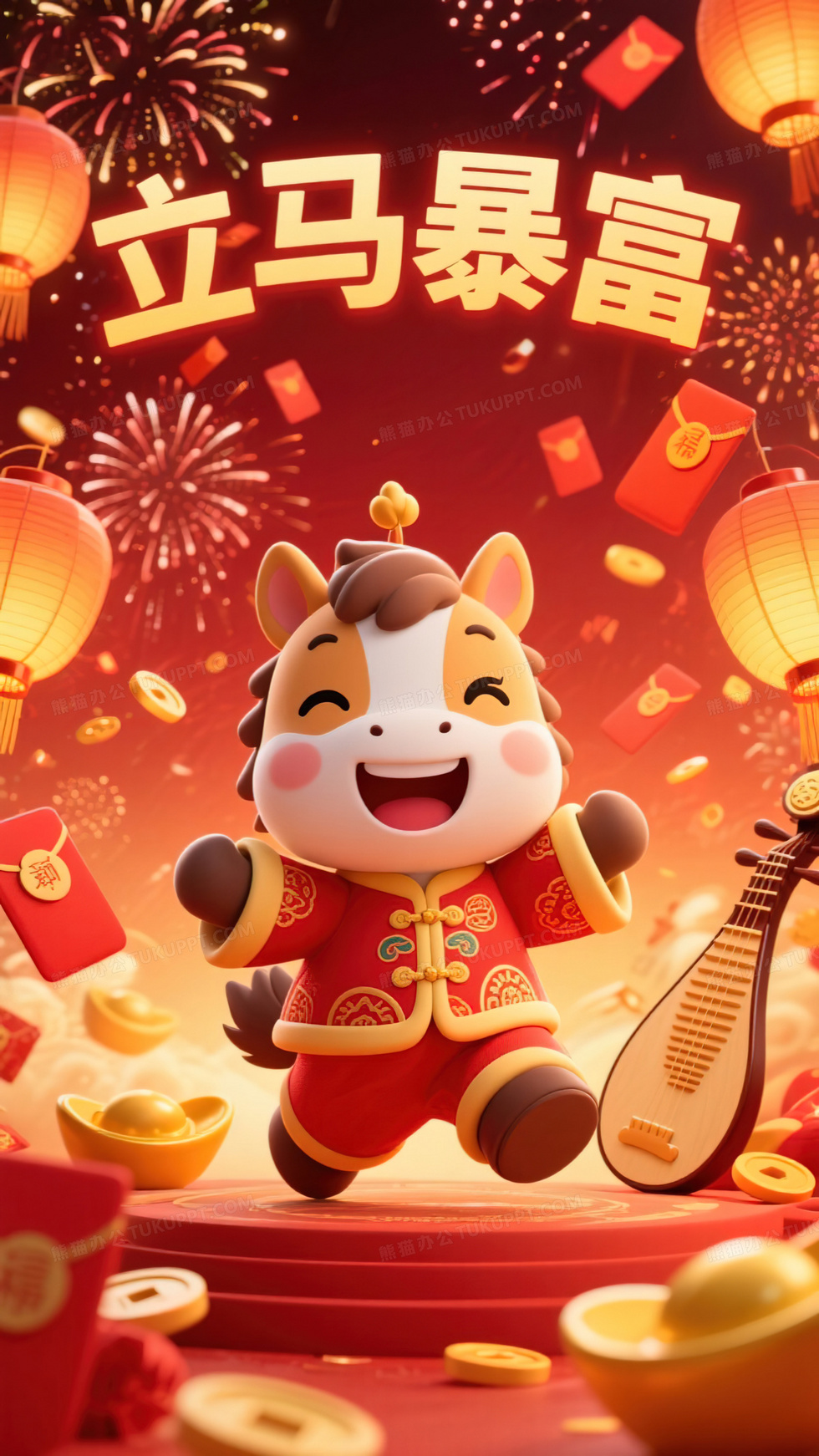 本作品内容为马年新年创意壁纸立马暴富卡通马插画, 格式为 jpg, 大小6 MB, 图片尺寸为1872 x 3328, 源文件无水印, 欢迎使用熊猫办公。 如认为平台内容涉嫌侵权,可通过邮件:tousu@tukuppt.com提出书面通知,我们将及时处理。