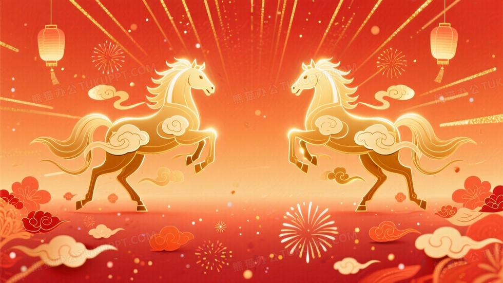 本作品内容为新年主题矢量插画对称式布局左右两侧靠边各有1匹小小的金色发光骏马前蹄腾跃, 格式为 jpg, 大小1 MB, 图片尺寸为1664 x 936, 作品中背景图片无需修改, 源文件无水印,可以直接使用, 欢迎使用熊猫办公。 如认为平台内容涉嫌侵权,可通过邮件:tousu@tukuppt.com提出书面通知,我们将及时处理。