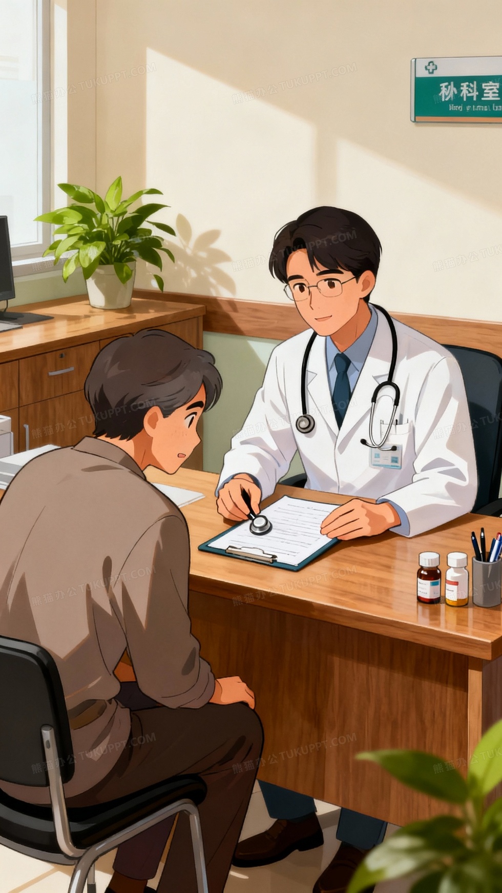 本作品内容为医生在医院给病人看病的插画, 格式为 jpg, 大小1 MB, 图片尺寸为1440 x 2560, 源文件无水印, 欢迎使用熊猫办公。 如认为平台内容涉嫌侵权,可通过邮件:tousu@tukuppt.com提出书面通知,我们将及时处理。