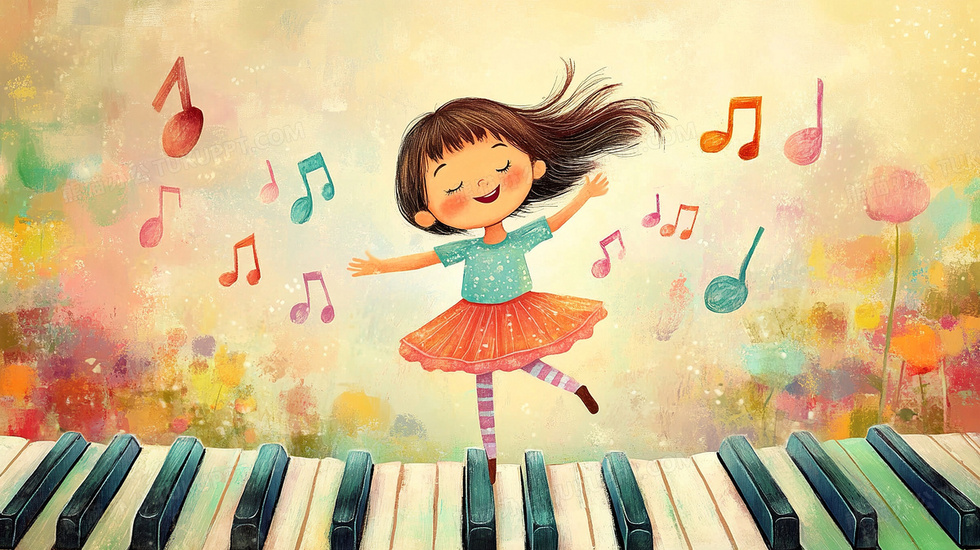 本作品内容为钢琴键上跳舞的小女孩卡通插画, 格式为 jpg, 大小4 MB, 图片尺寸为2912 x 1632, 源文件无水印, 欢迎使用熊猫办公。 如认为平台内容涉嫌侵权,可通过邮件:tousu@tukuppt.com提出书面通知,我们将及时处理。