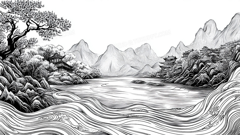 本作品内容为中国风山水白描环境手绘风景插画, 格式为 jpg, 大小4 MB, 图片尺寸为2912 x 1632, 源文件无水印, 欢迎使用熊猫办公。 如认为平台内容涉嫌侵权,可通过邮件:tousu@tukuppt.com提出书面通知,我们将及时处理。