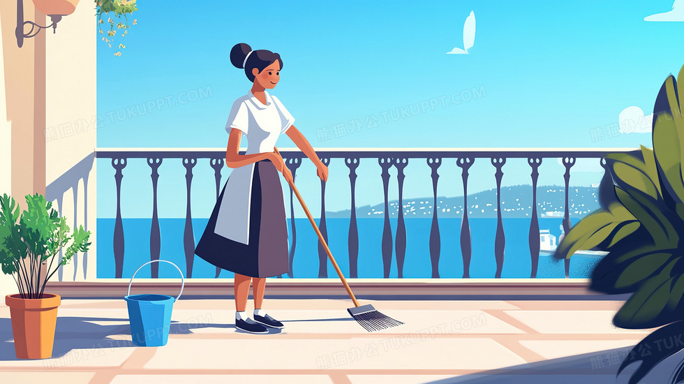 本作品内容为家政清扫阳台地面插画, 格式为 jpg, 大小3 MB, 图片尺寸为2912 x 1632, 源文件无水印, 欢迎使用熊猫办公。 如认为平台内容涉嫌侵权,可通过邮件:tousu@tukuppt.com提出书面通知,我们将及时处理。