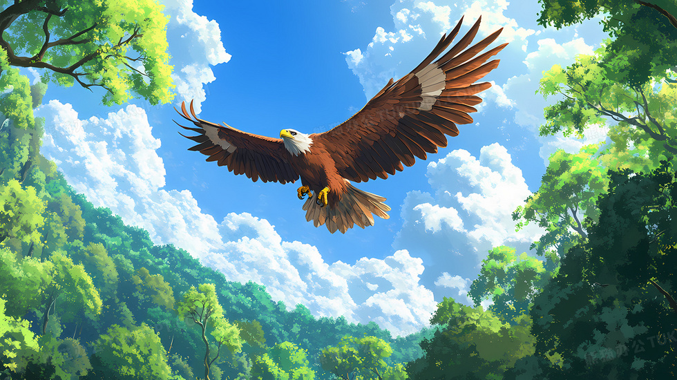 本作品内容为森林上空的老鹰插画, 格式为 jpg, 大小6 MB, 图片尺寸为2912 x 1632, 源文件无水印, 欢迎使用熊猫办公。 如认为平台内容涉嫌侵权,可通过邮件:tousu@tukuppt.com提出书面通知,我们将及时处理。