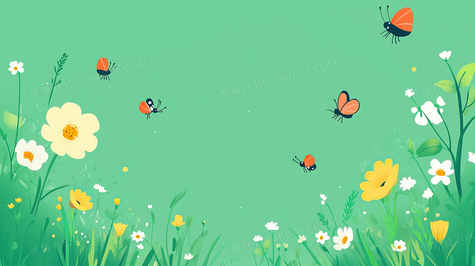 本作品内容为绿色卡通春天花丛蝴蝶背景, 格式为 jpg, 大小2 MB, 图片尺寸为2912 x 1632, 作品中背景图片无需修改, 源文件无水印,可以直接使用, 欢迎使用熊猫办公。 如认为平台内容涉嫌侵权,可通过邮件:tousu@tukuppt.com提出书面通知,我们将及时处理。
