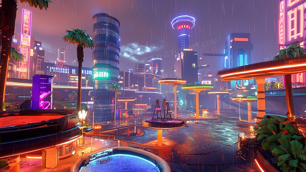 本作品内容为赛博朋克风格未来城市虚拟建筑物插画, 格式为 jpg, 大小4 MB, 图片尺寸为2912 x 1632, 源文件无水印, 欢迎使用熊猫办公。 如认为平台内容涉嫌侵权,可通过邮件:tousu@tukuppt.com提出书面通知,我们将及时处理。
