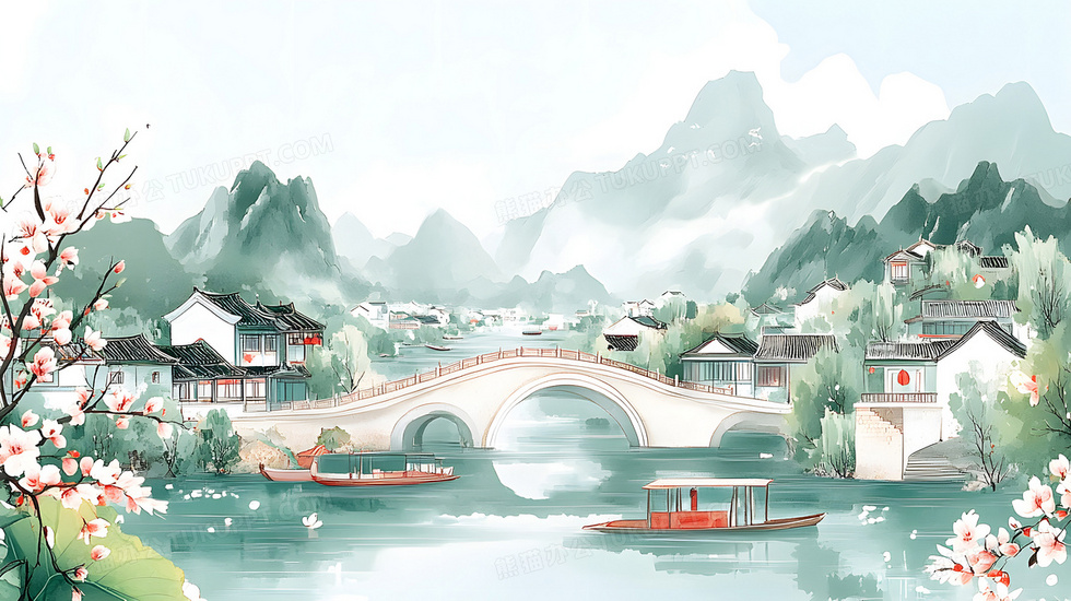本作品内容为插画水彩风格江南水乡青山绿水石桥小船唯美风光, 格式为 jpg, 大小3 MB, 图片尺寸为2912 x 1632, 源文件无水印, 欢迎使用熊猫办公。 如认为平台内容涉嫌侵权,可通过邮件:tousu@tukuppt.com提出书面通知,我们将及时处理。