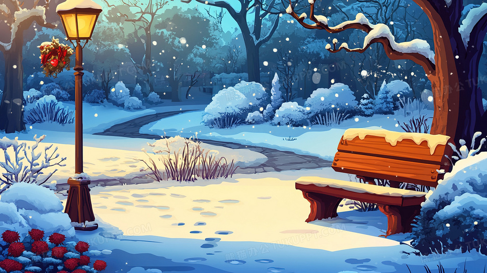 本作品内容为唯美风景冬天冬季户外美丽的公园插画, 格式为 jpg, 大小3 MB, 图片尺寸为2912 x 1632, 源文件无水印, 欢迎使用熊猫办公。 如认为平台内容涉嫌侵权,可通过邮件:tousu@tukuppt.com提出书面通知,我们将及时处理。