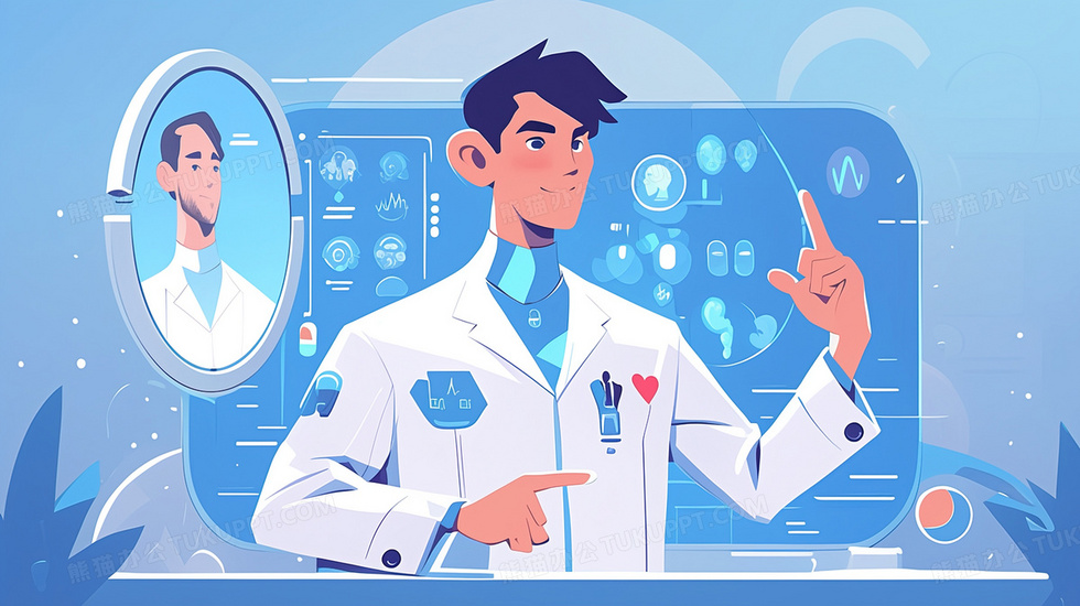 本作品内容为男医生线上会诊治疗插画, 格式为 jpg, 大小2 MB, 图片尺寸为2912 x 1632, 源文件无水印, 欢迎使用熊猫办公。 如认为平台内容涉嫌侵权,可通过邮件:tousu@tukuppt.com提出书面通知,我们将及时处理。